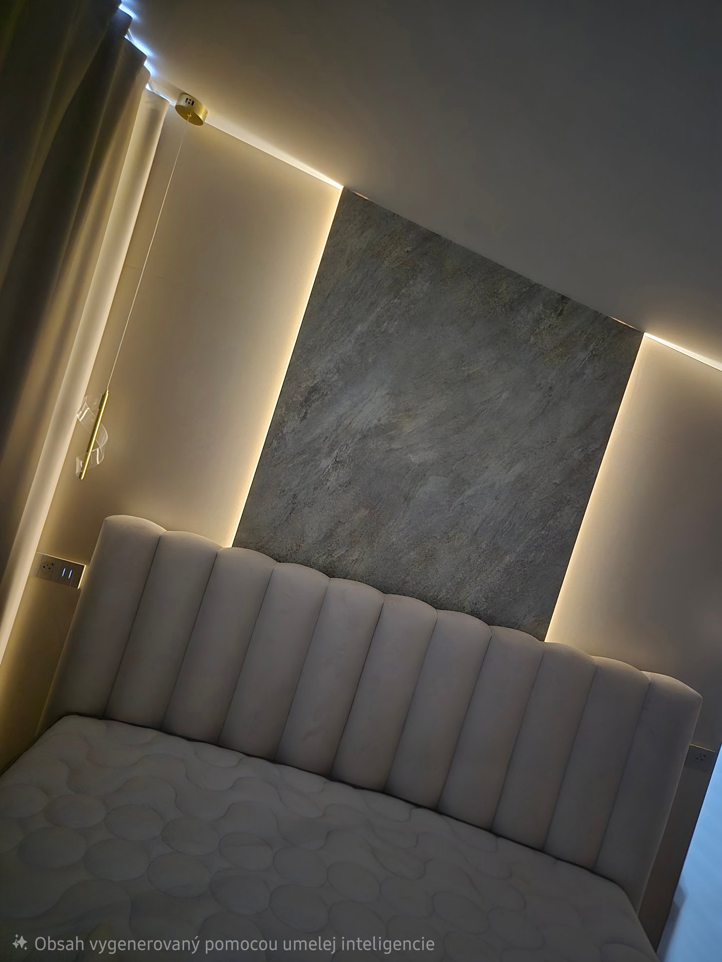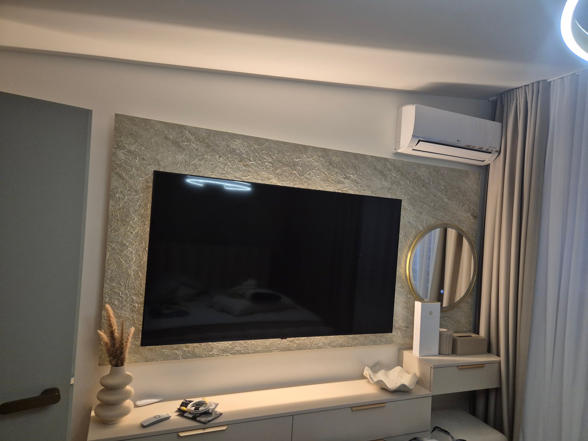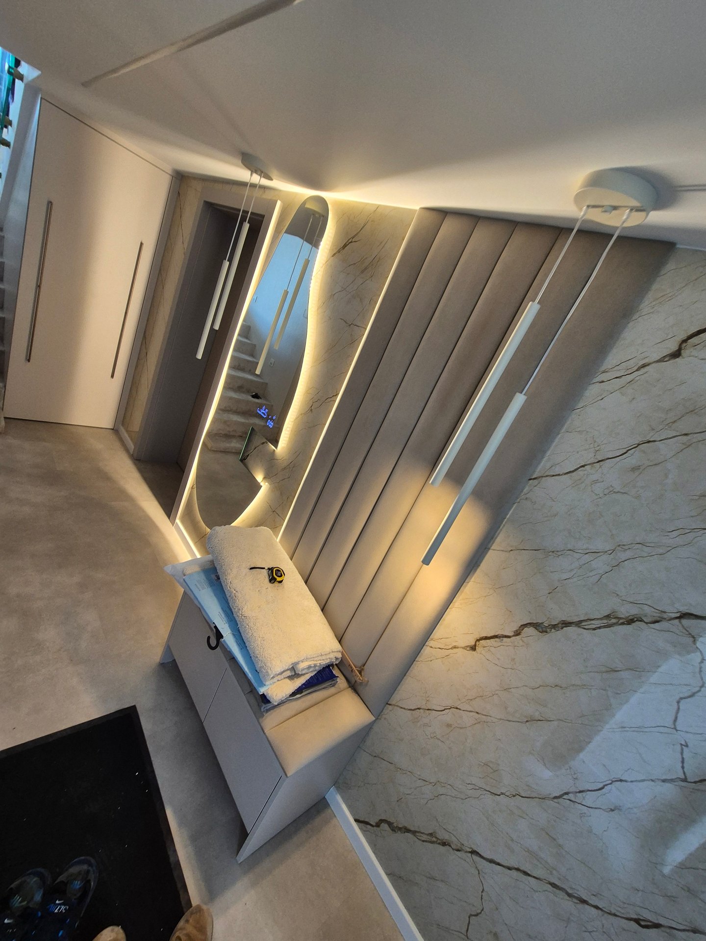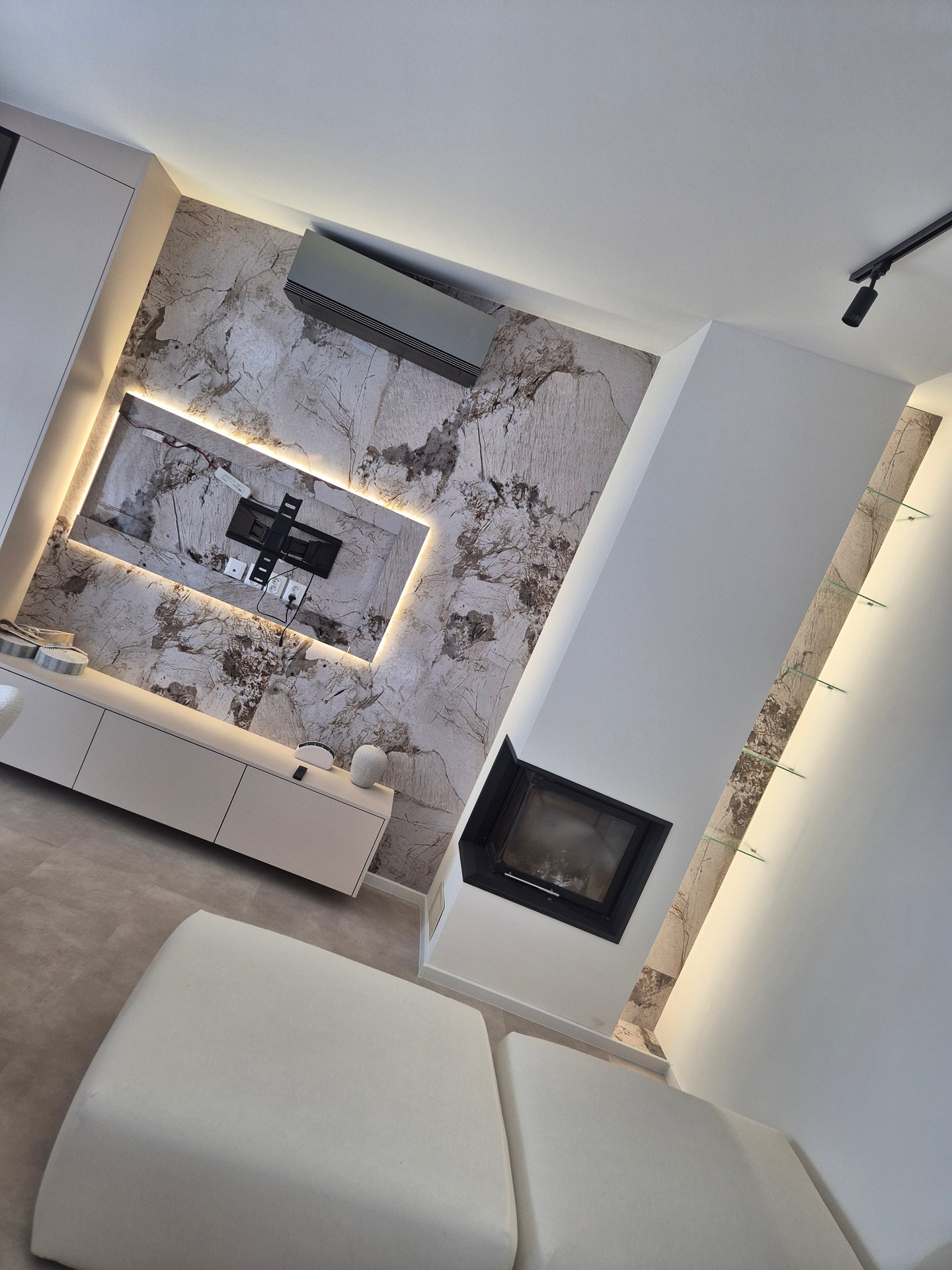 Realizovali sme tu zástenu v obývačke s podsvietením za TV, niku vedľa kŕbu kde sme sa museli vysporiadať s pôsobením tepla aj na osvetlenie a osadenie políc, v spálni sme realizovali zástenu za TV s odsadením, pre minimalizáciu viditeľnosti príslušenstva za TV a osadením podsvieteného zrkadla a skríň. Zástena za posteľ bola urobená z toho istého materiálu aby ladila s interiérom, pričom sme doplnili osvetlenie spoza panelu pre jemný a luxusný efekt. Čerešničkou na torte už bola len vstupná chodba.